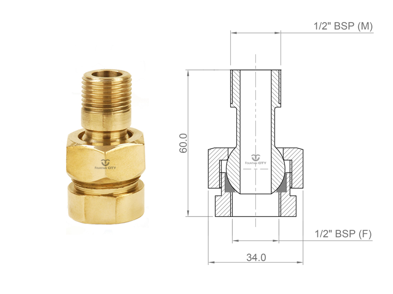 Шарнирное соединение FCI 1 производства "Фонтан СИТИ" предназначено для подсоединения фонтанных насадок к водяным коллекторам с последующей регулировкой положения струи. В некоторых случаях используется для заужения или расширения подключения фонтанной насадки.