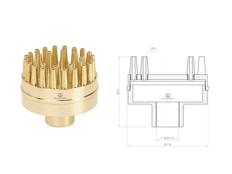 Фонтанная насадка FCI "Waterspout" наилучшим образом подходит для фонтанов в помещениях с классической формой чаши. Насадка включает от 30 до 50 одноструйных насадок и сопел диаметром 4 мм.