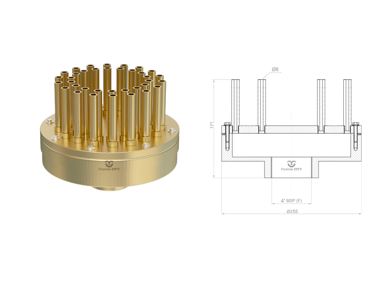 Фонтанная насадка FCI "Waterspout" наилучшим образом подходит для фонтанов в помещениях с классической формой чаши. Насадка включает от 30 до 50 одноструйных насадок и сопел диаметром 4 мм.