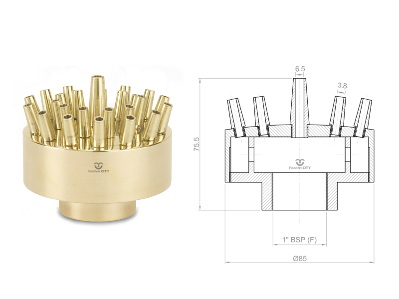 Фонтанная насадка FCI "Vulcan" K наилучшим образом подходит для уличных фонтанов с классической формой чаши. Насадка включает от 19 до 26 одноструйных насадок типа Комета и несколько значений характеристик сопел диаметром от 3 до 10 мм.