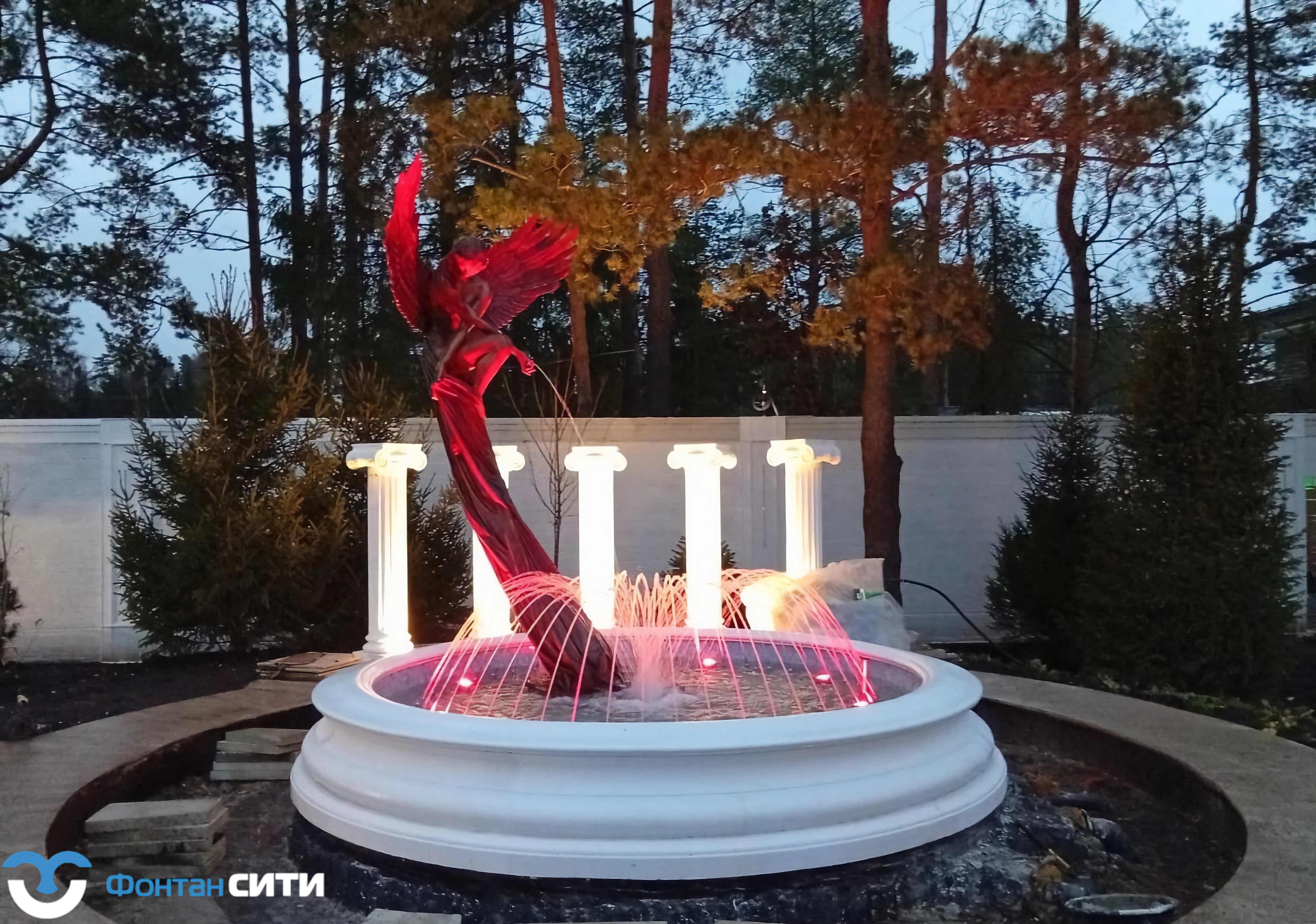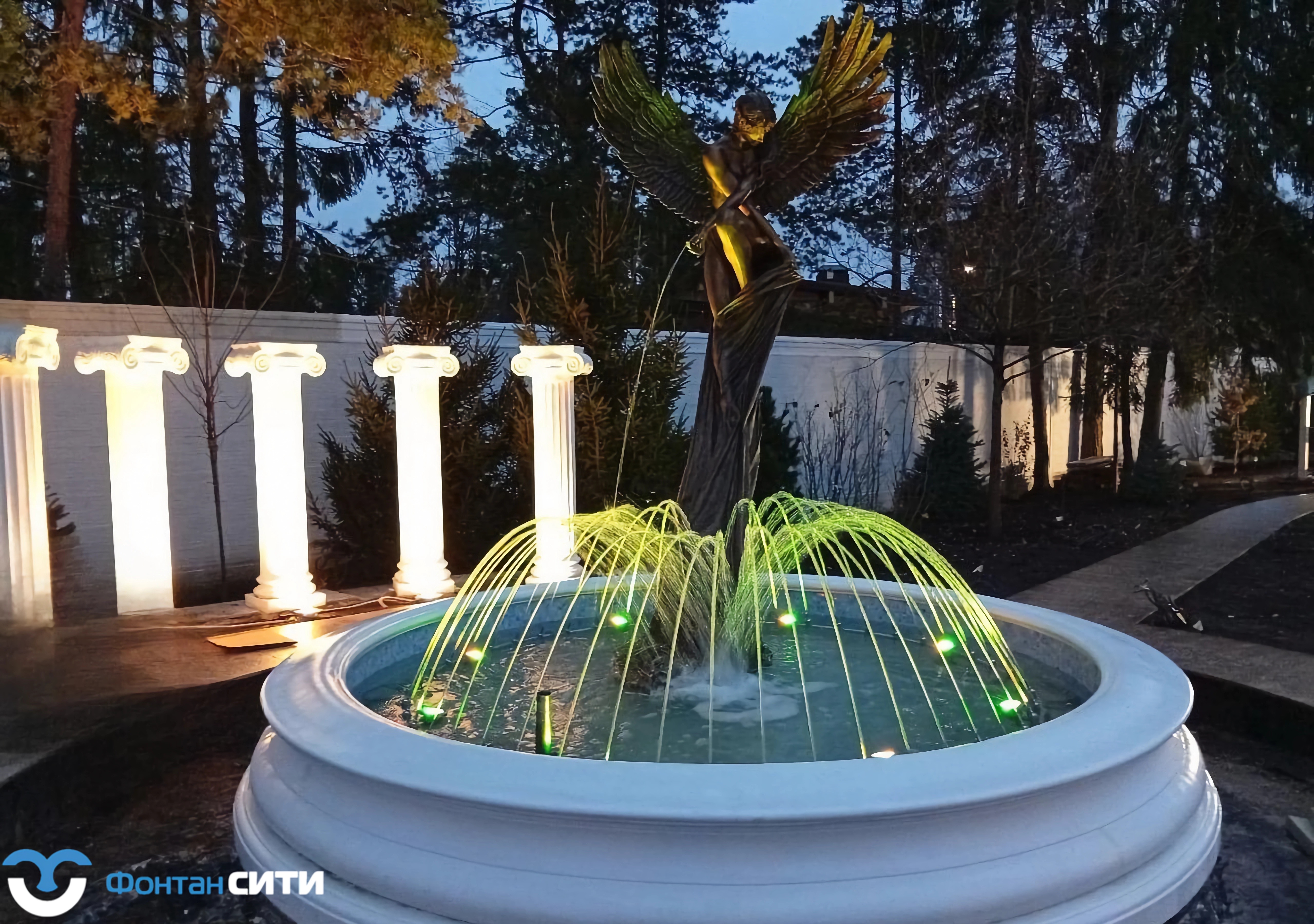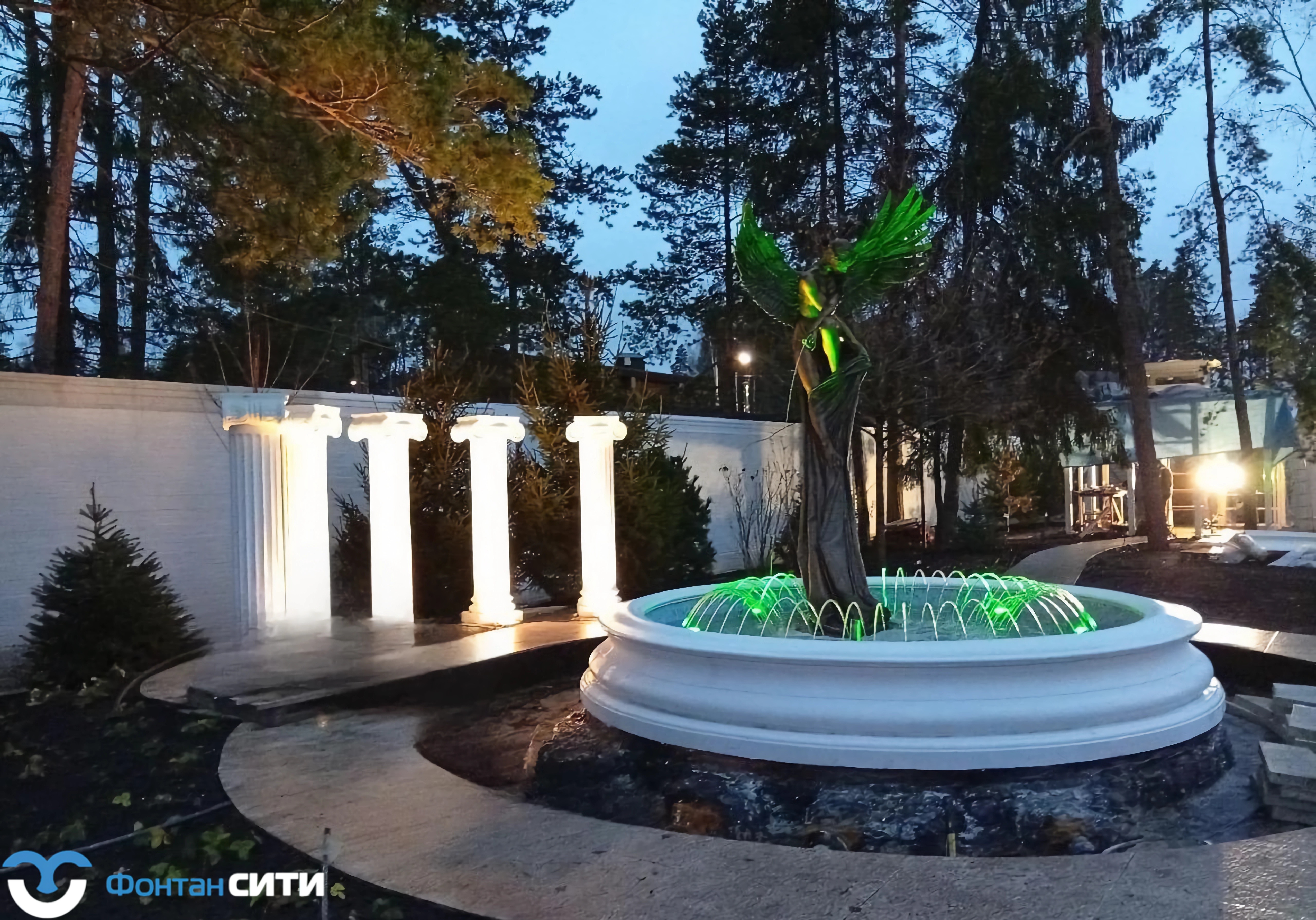 Фонтан с художественной скульптурой ангела спроектирован как центральный акцент объекта. Композиция основана на круглой белой чаше с широким многоярусным бортом, в центре которой возвышается изящная фигура с расправленными крыльями. Вдоль периметра установлены дугообразные водяные струи, формирующие правильный световой купол над водой. За фонтаном расположена подсвечиваемая колоннада, создающая архитектурный фон и визуально поддерживающая композицию в вечернее время.