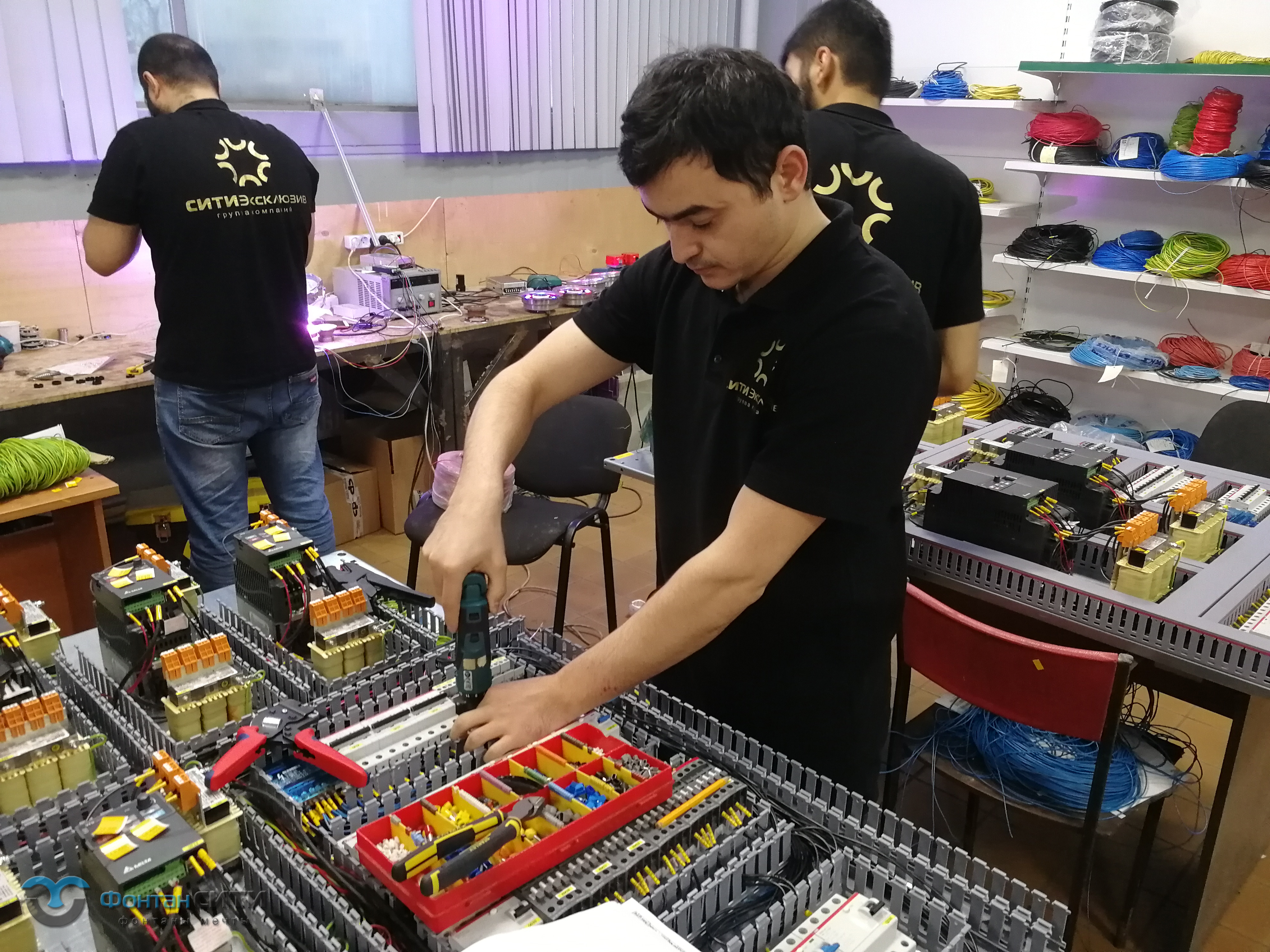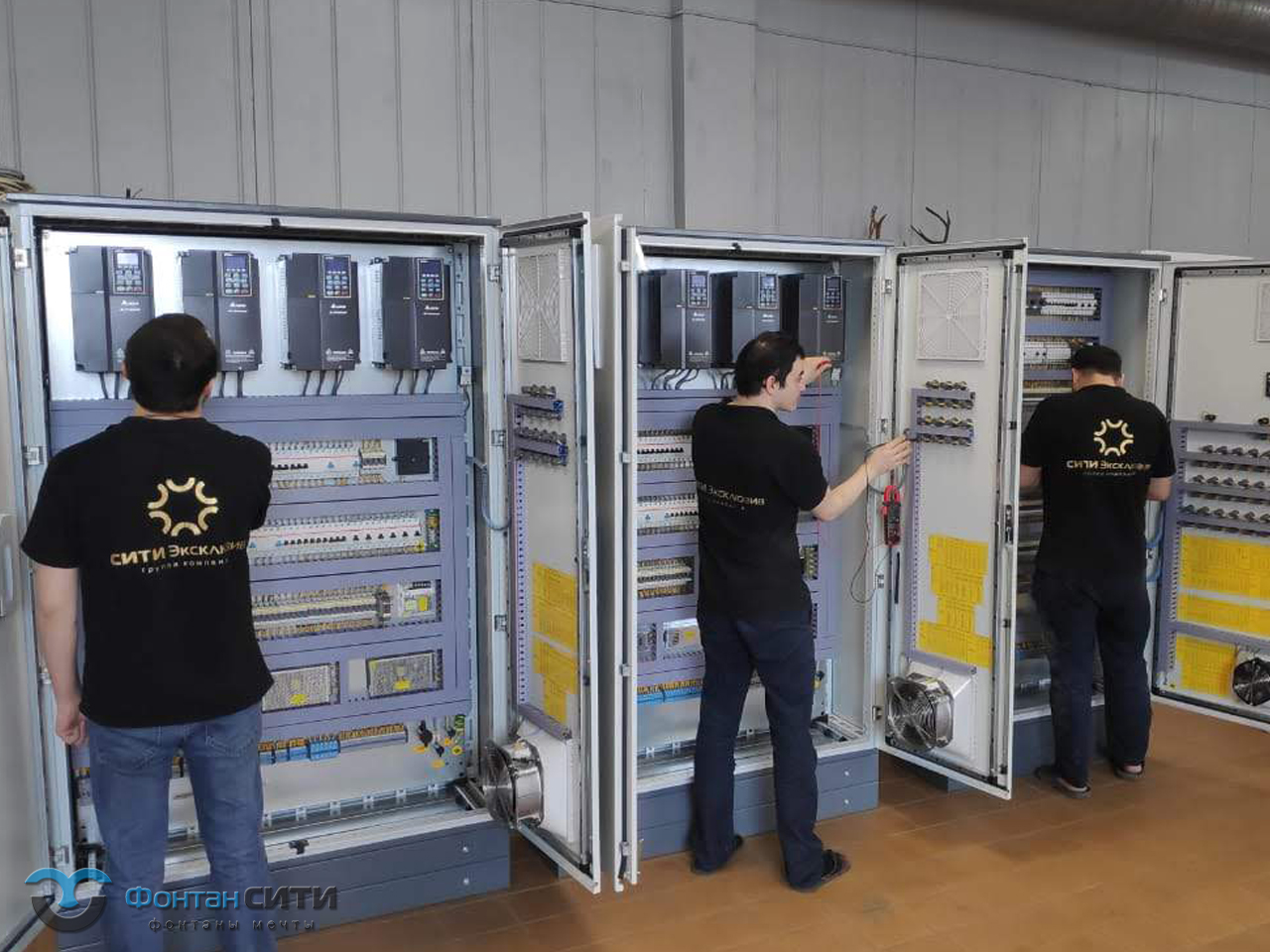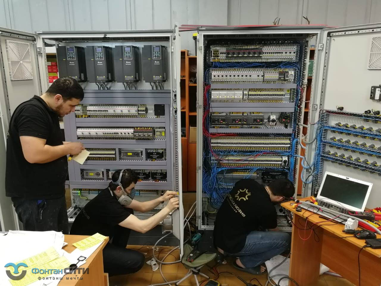 Монтаж электрооборудования осуществляется на заключительном этапе строительства фонтана, с привлечением сотрудников, имеющих доступ по электробезопасности до 1000 Вольт и имеющих опыт настройки автоматики фонтанов.